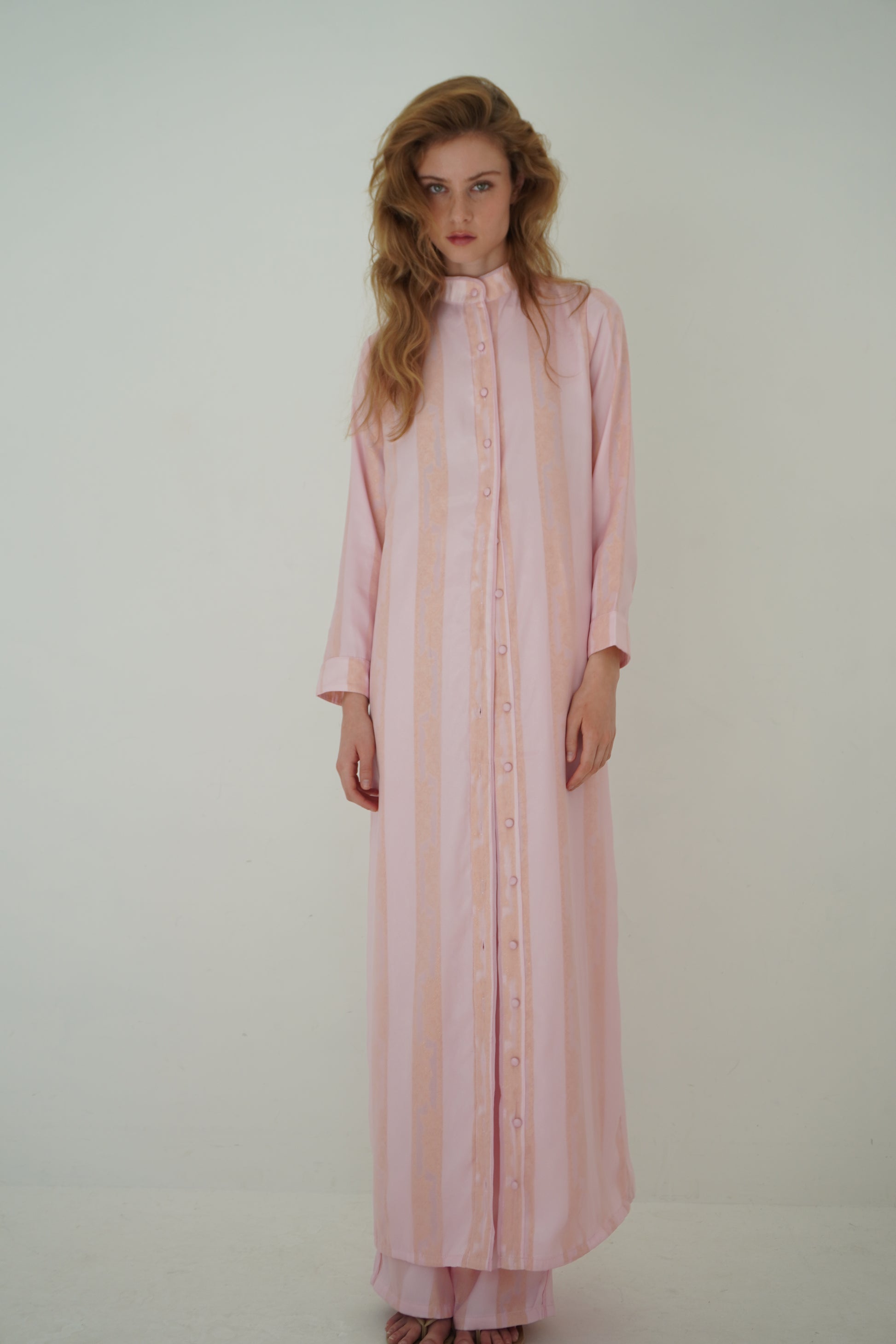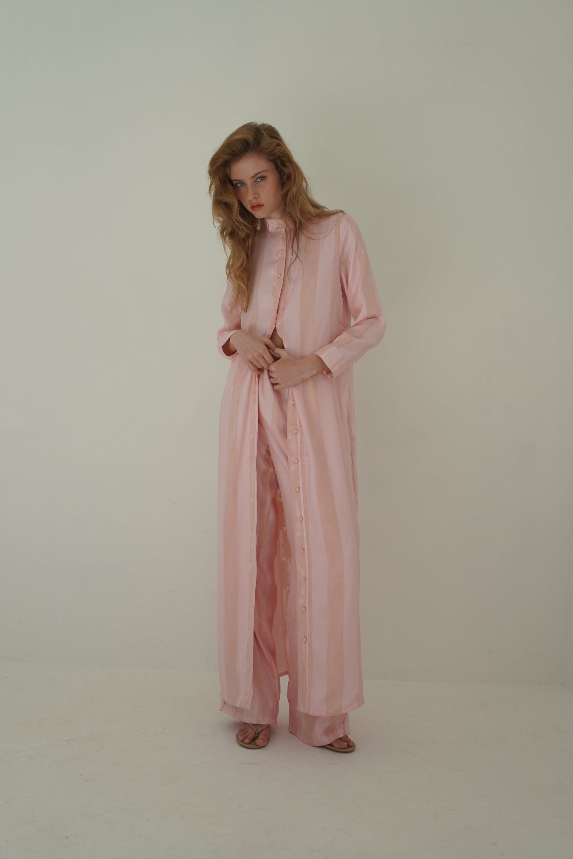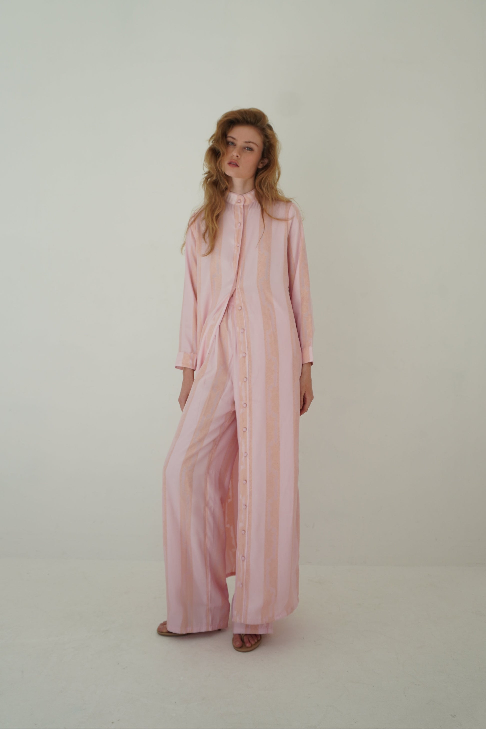 The maxi shirt is designed with a relaxed yet refined silhouette, featuring a button-down front. The modest trousers are tailored to perfection, with a wide-leg cut that complements the shirt’s fluidity, ensuring a flattering and comfortable fit. Together, this set is ideal for both daytime and evening events.