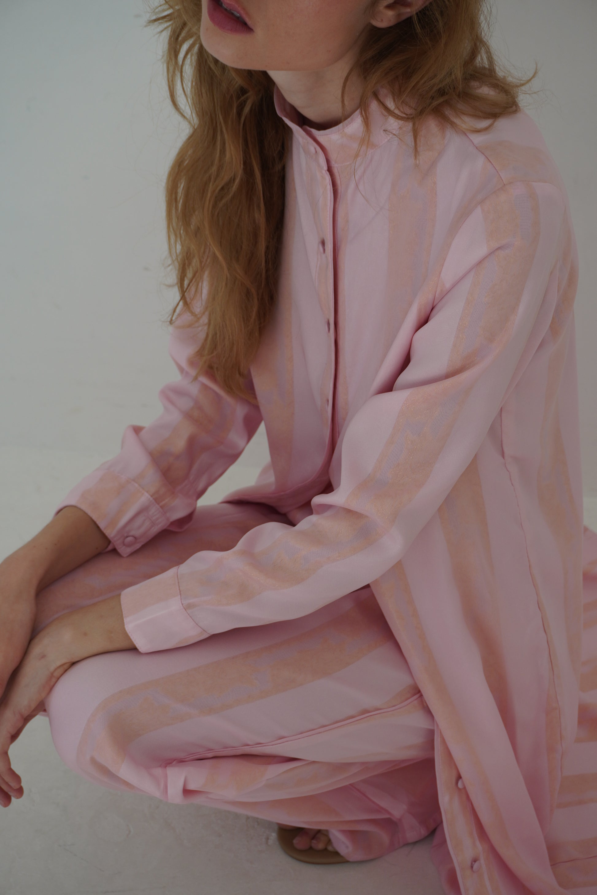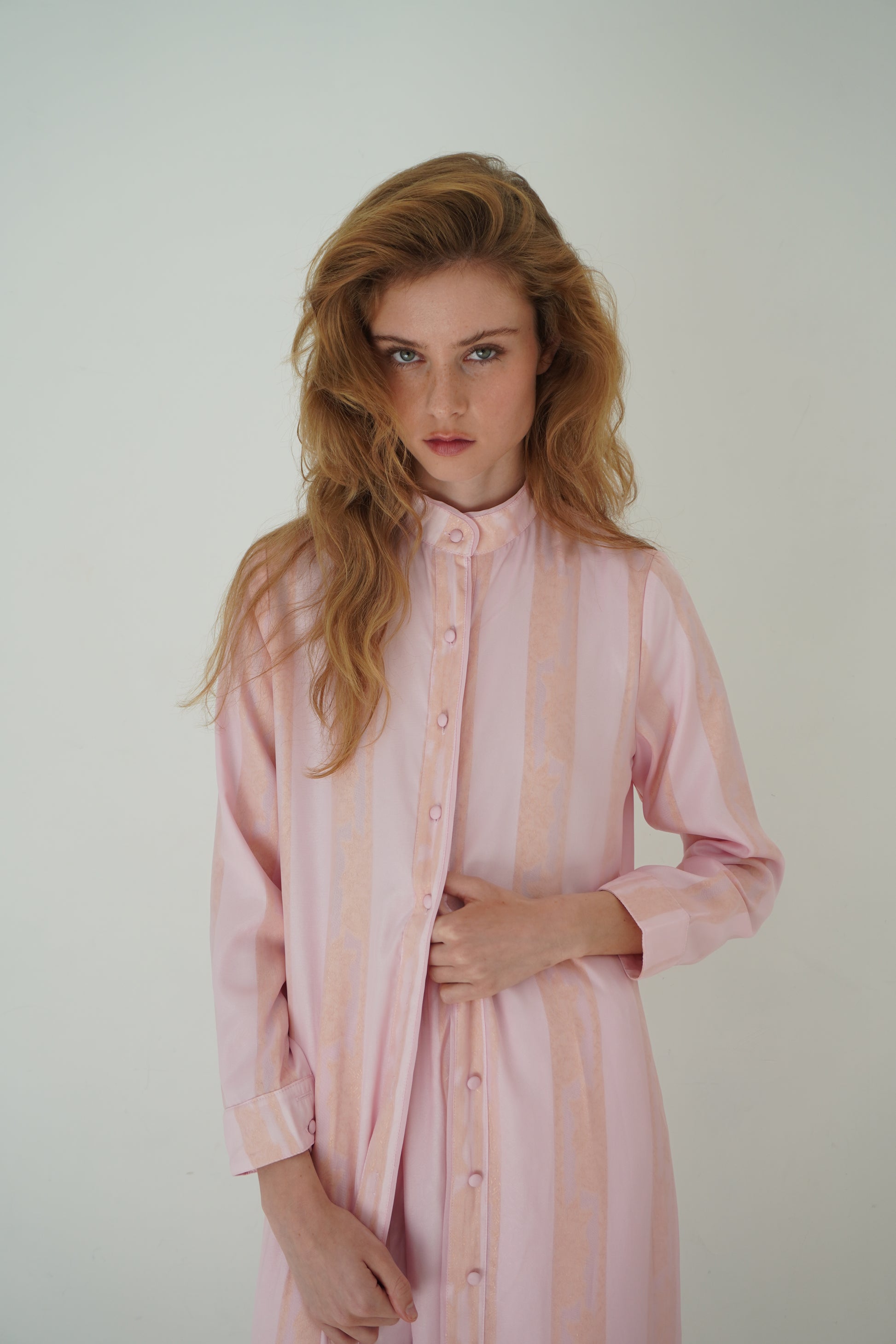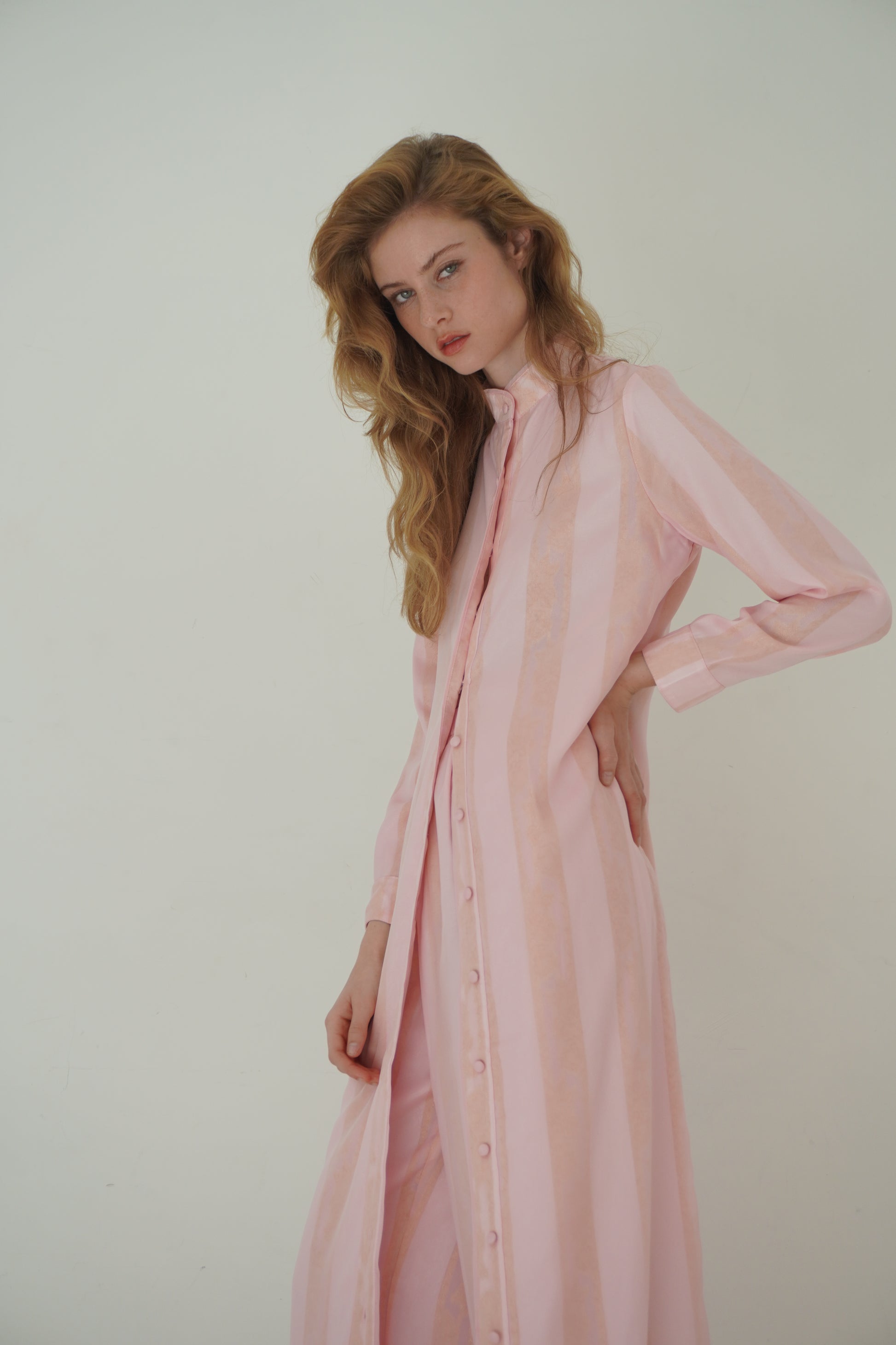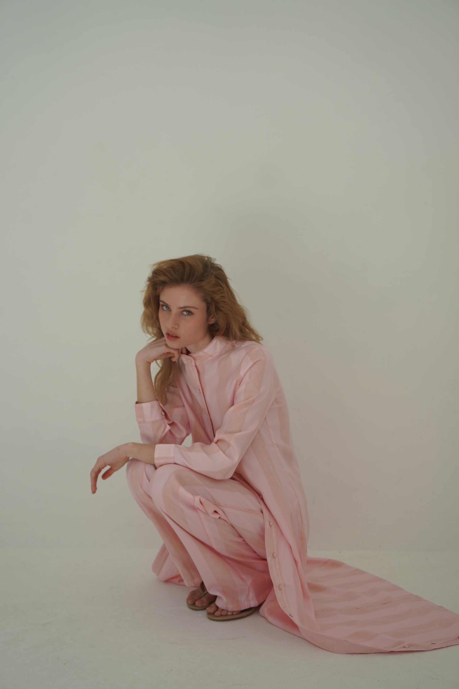 The maxi shirt is designed with a relaxed yet refined silhouette, featuring a button-down front. The modest trousers are tailored to perfection, with a wide-leg cut that complements the shirt’s fluidity, ensuring a flattering and comfortable fit. Together, this set is ideal for both daytime and evening events.