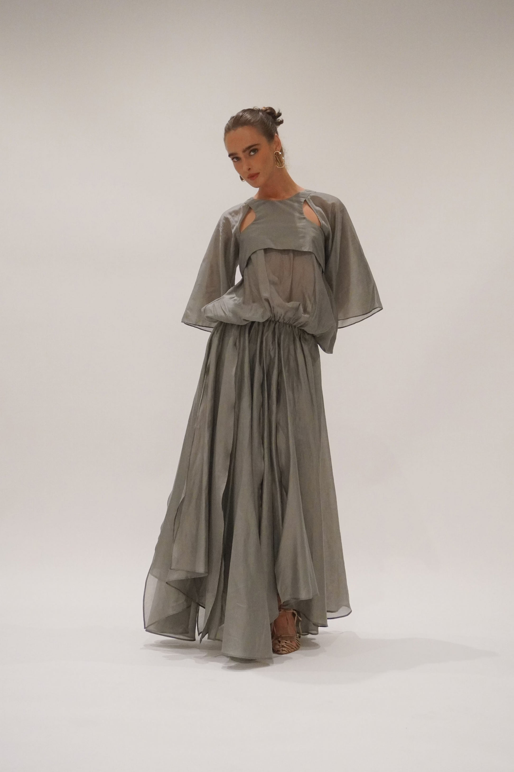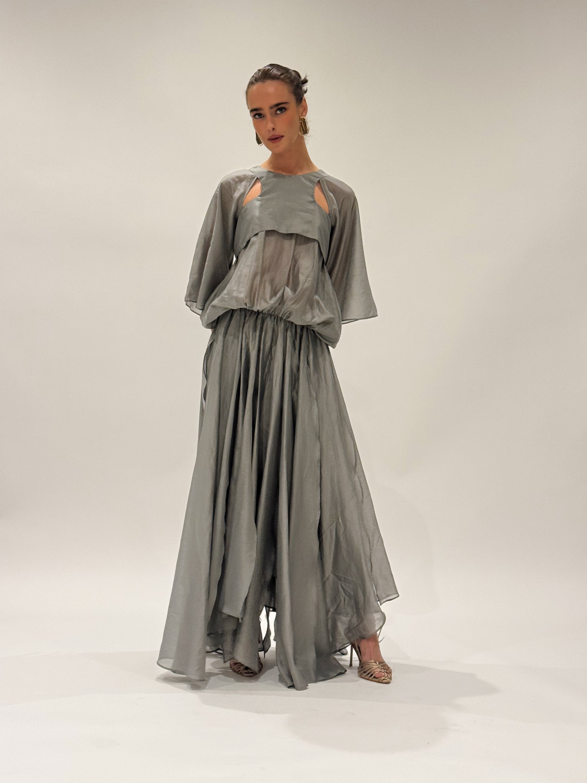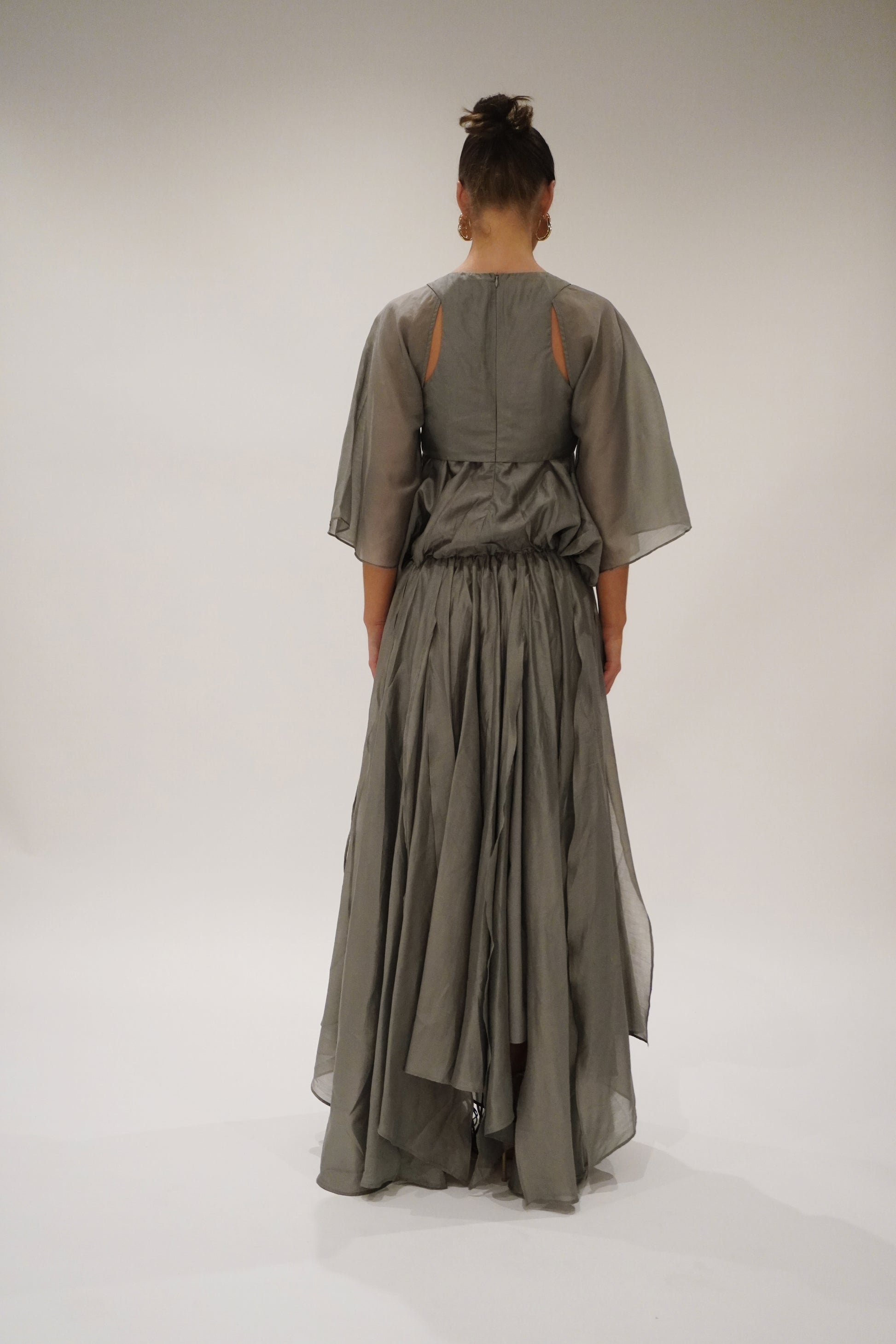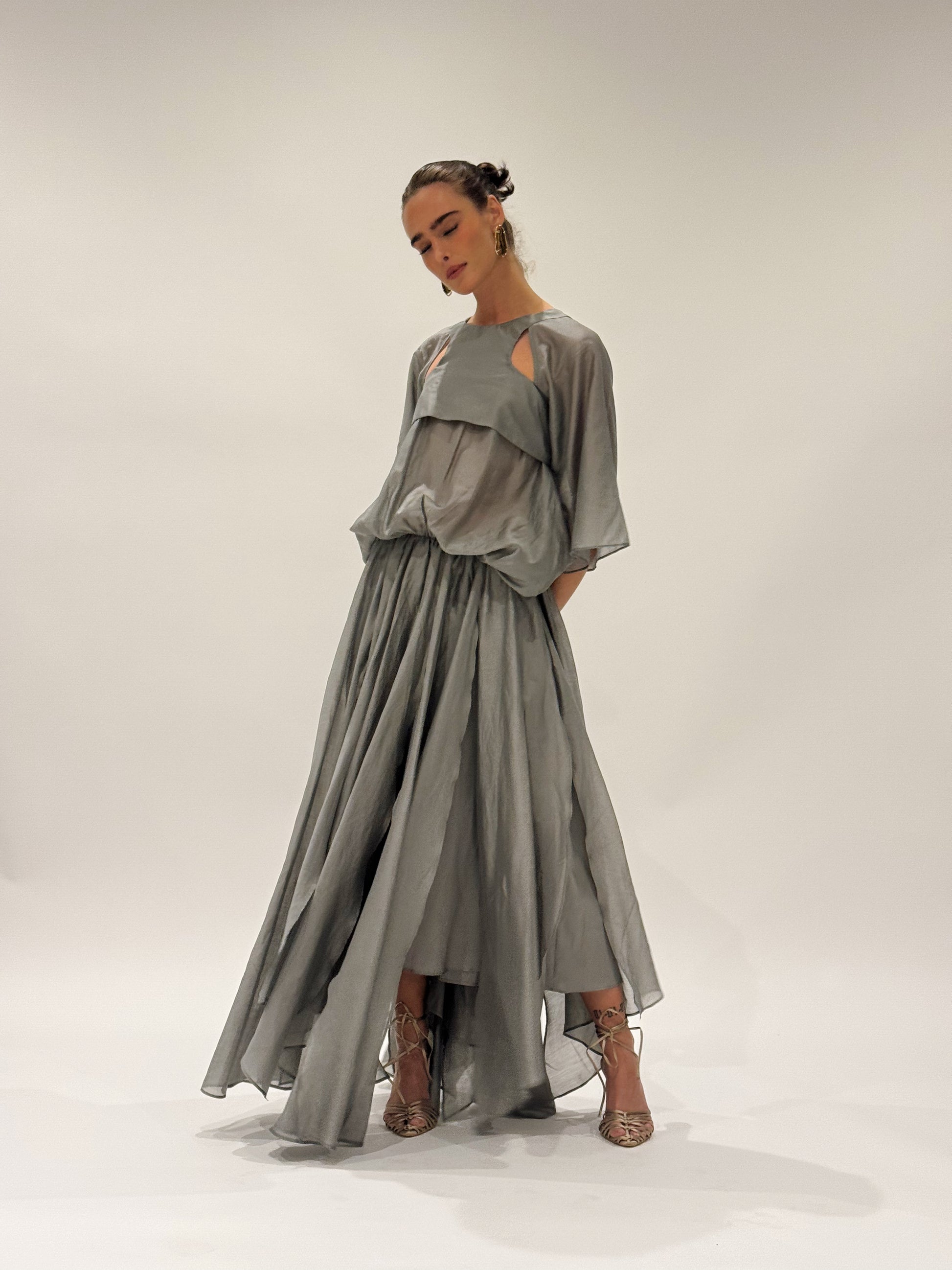Cut in a charcoal-toned organza with a soft metallic sheen, the silhouette is elemental and sculptural. Racer-style cut-out on the body, with a voluminous batwing sleeve and volume bubble effect top. Creating presence with every step. The skirt flows in off-cut layers, unfinished and raw, yet perfectly considered.