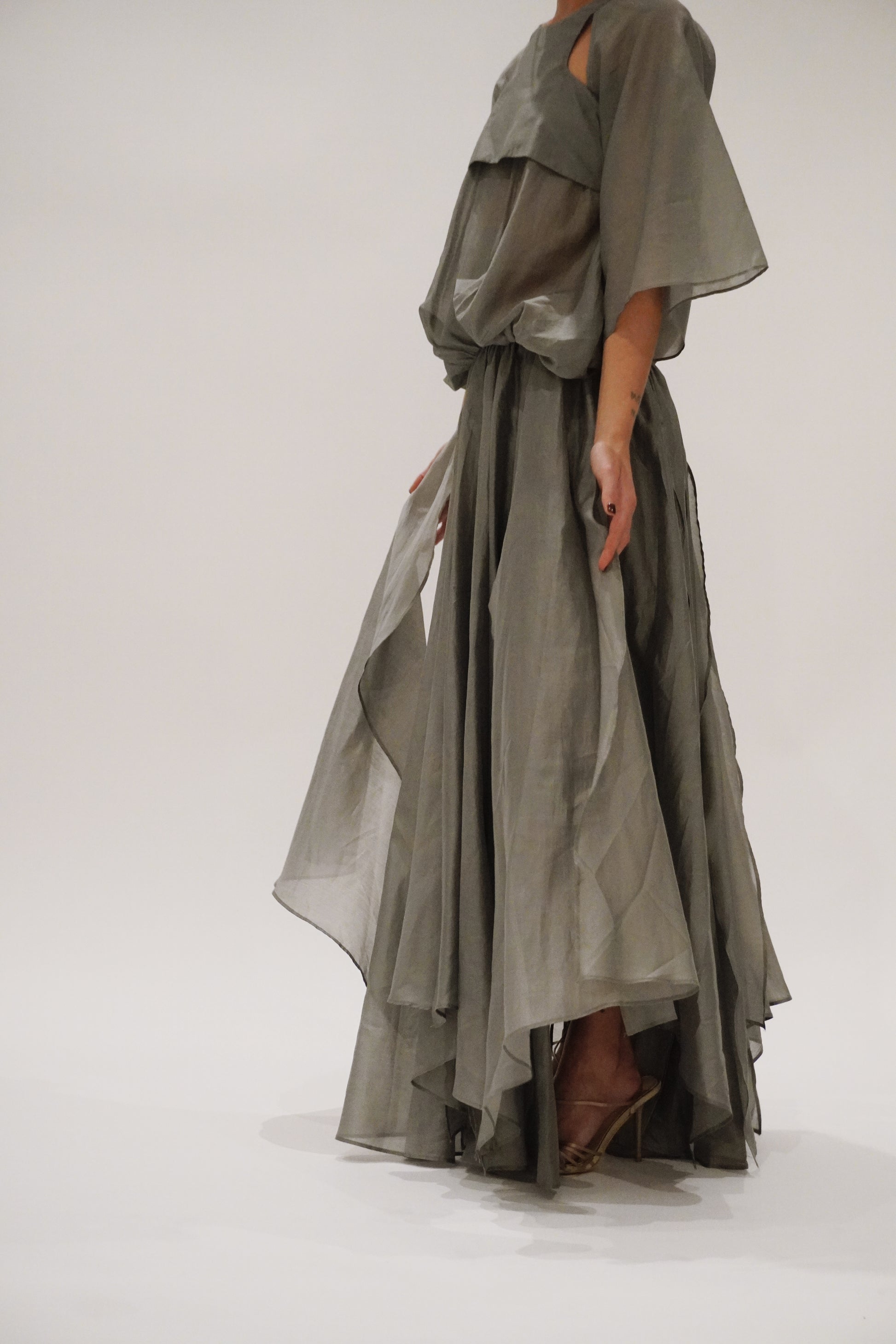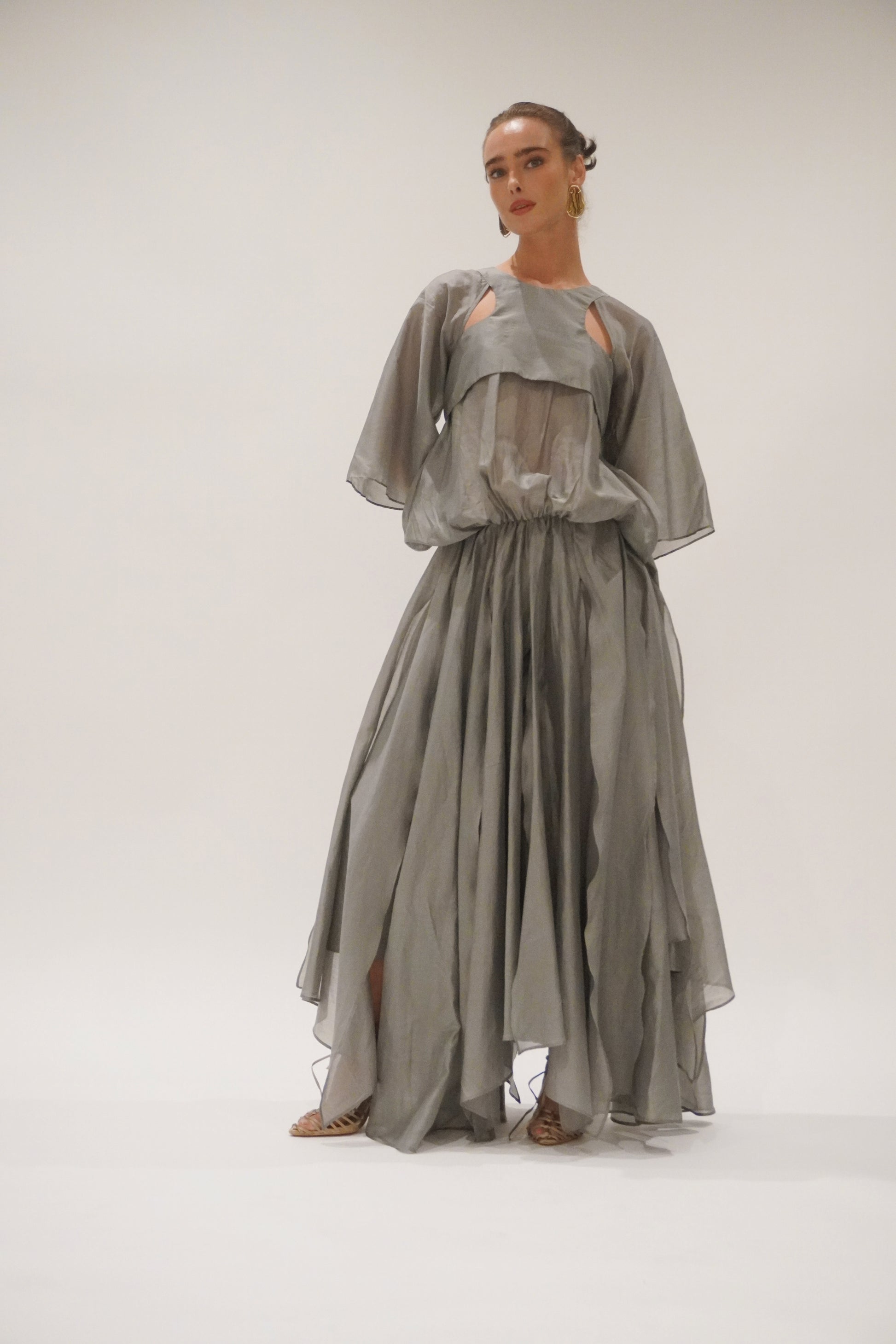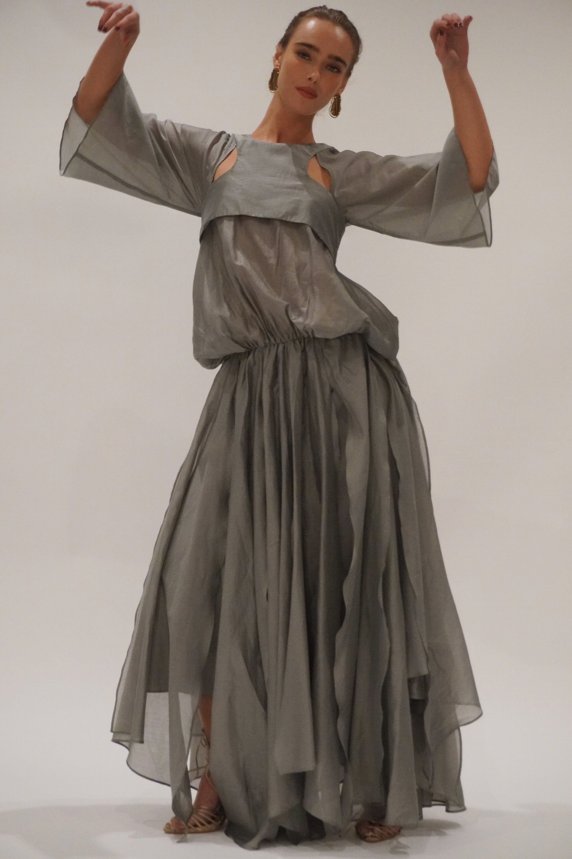 Cut in a charcoal-toned organza with a soft metallic sheen, the silhouette is elemental and sculptural. Racer-style cut-out on the body, with a voluminous batwing sleeve and volume bubble effect top. Creating presence with every step. The skirt flows in off-cut layers, unfinished and raw, yet perfectly considered.