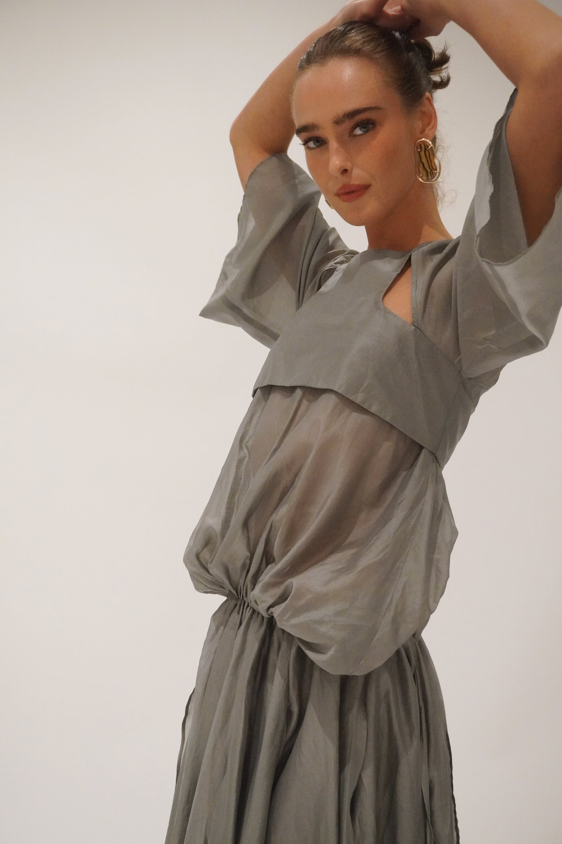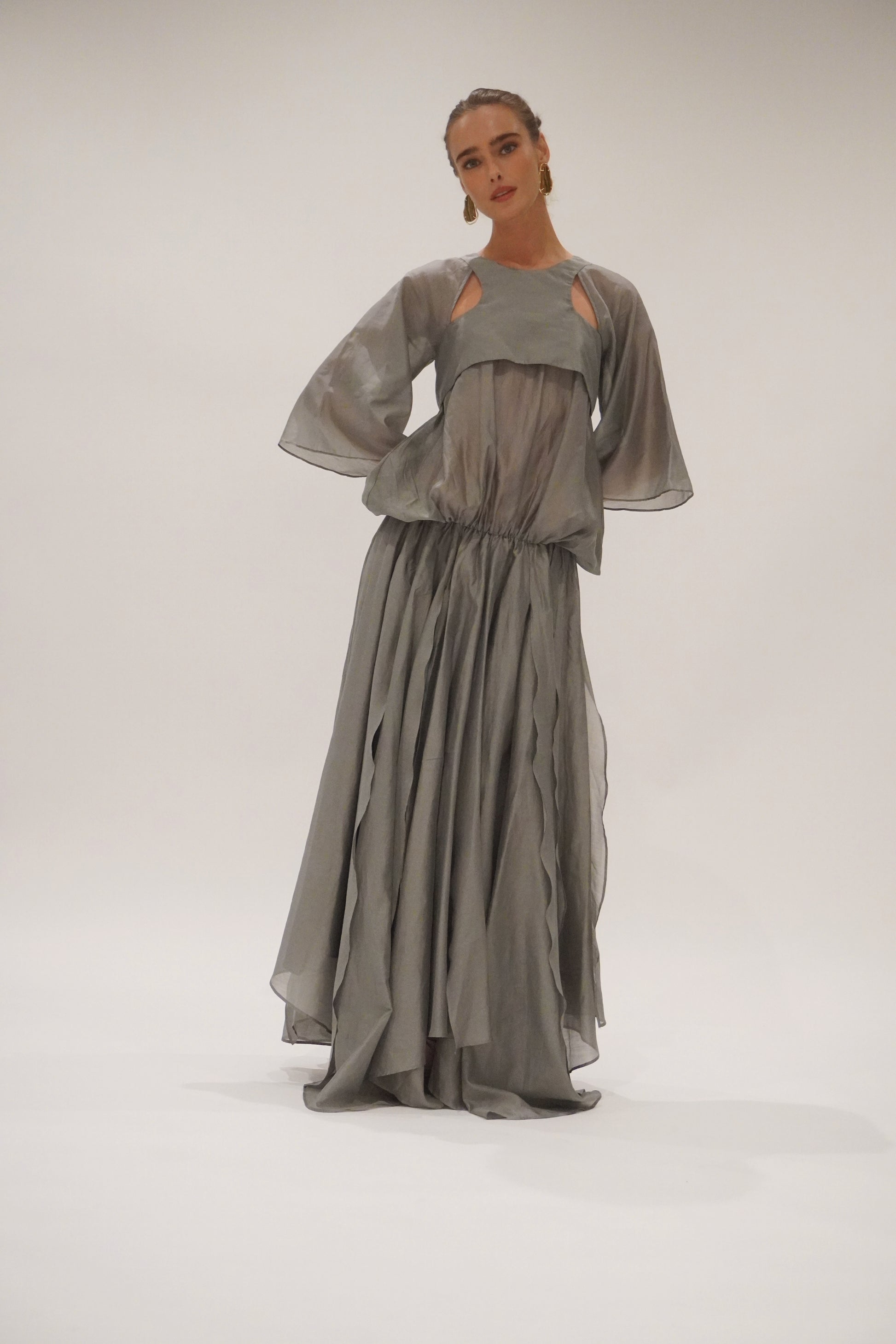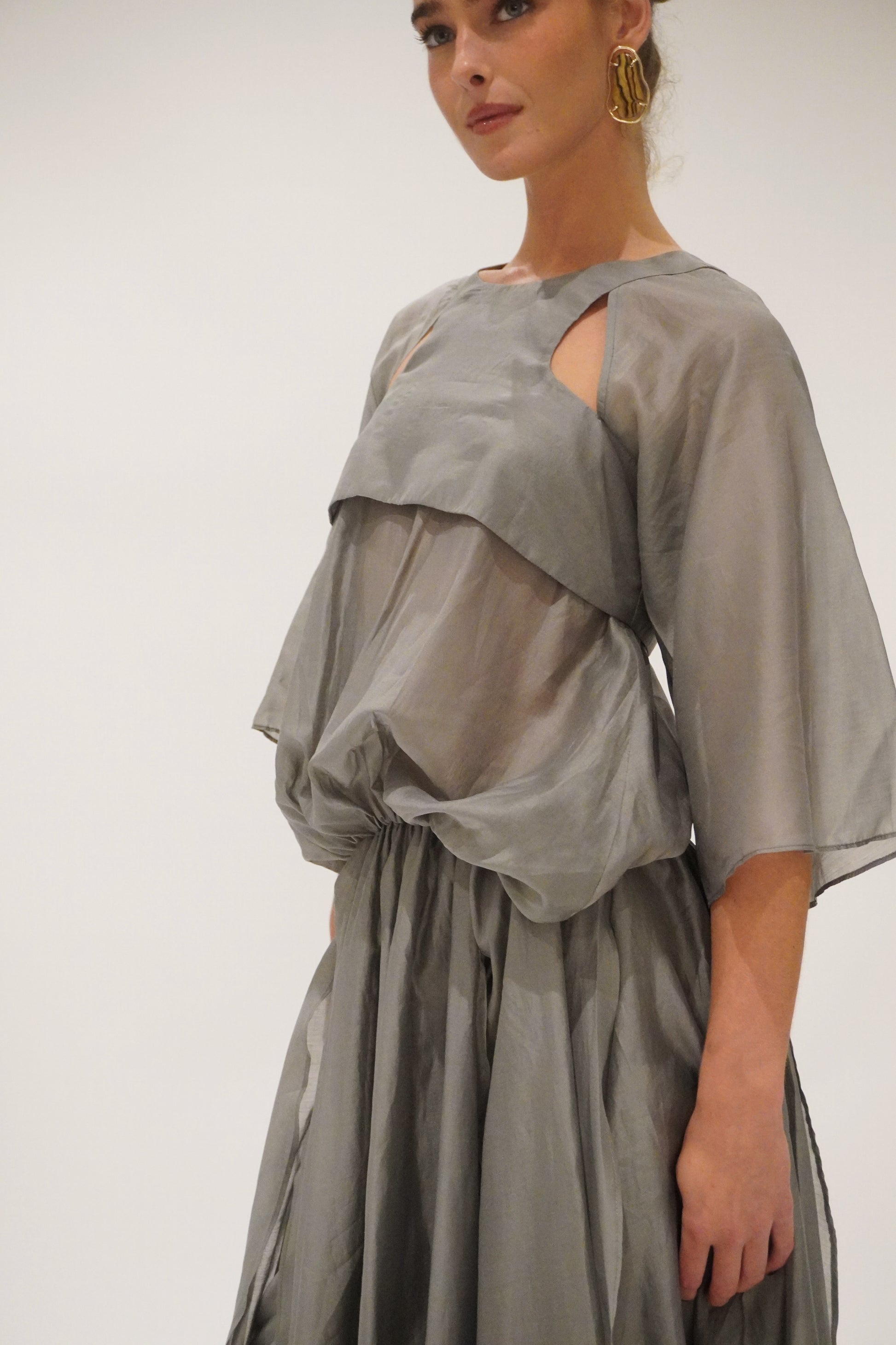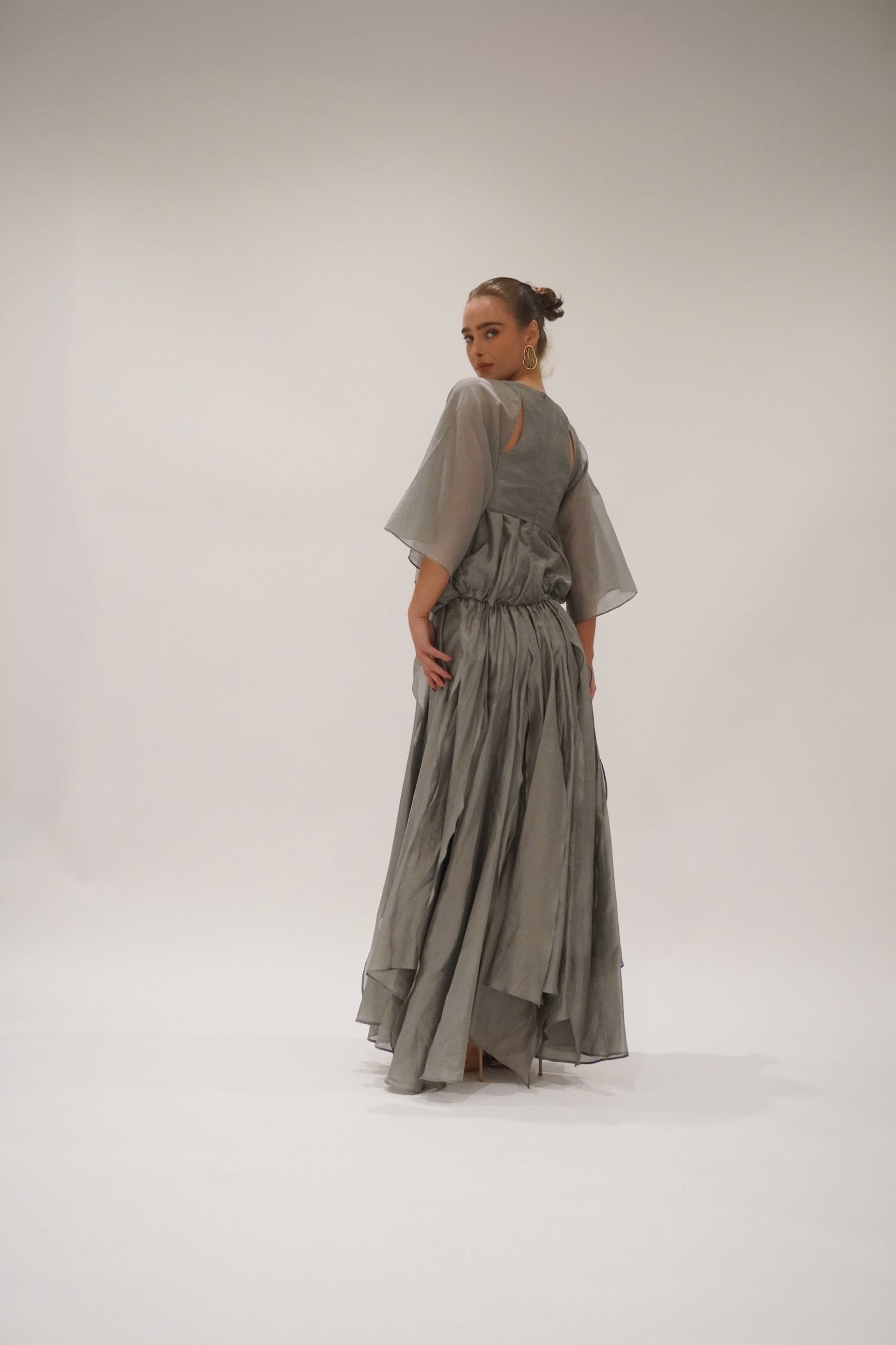 Cut in a charcoal-toned organza with a soft metallic sheen, the silhouette is elemental and sculptural. Racer-style cut-out on the body, with a voluminous batwing sleeve and volume bubble effect top. Creating presence with every step. The skirt flows in off-cut layers, unfinished and raw, yet perfectly considered.