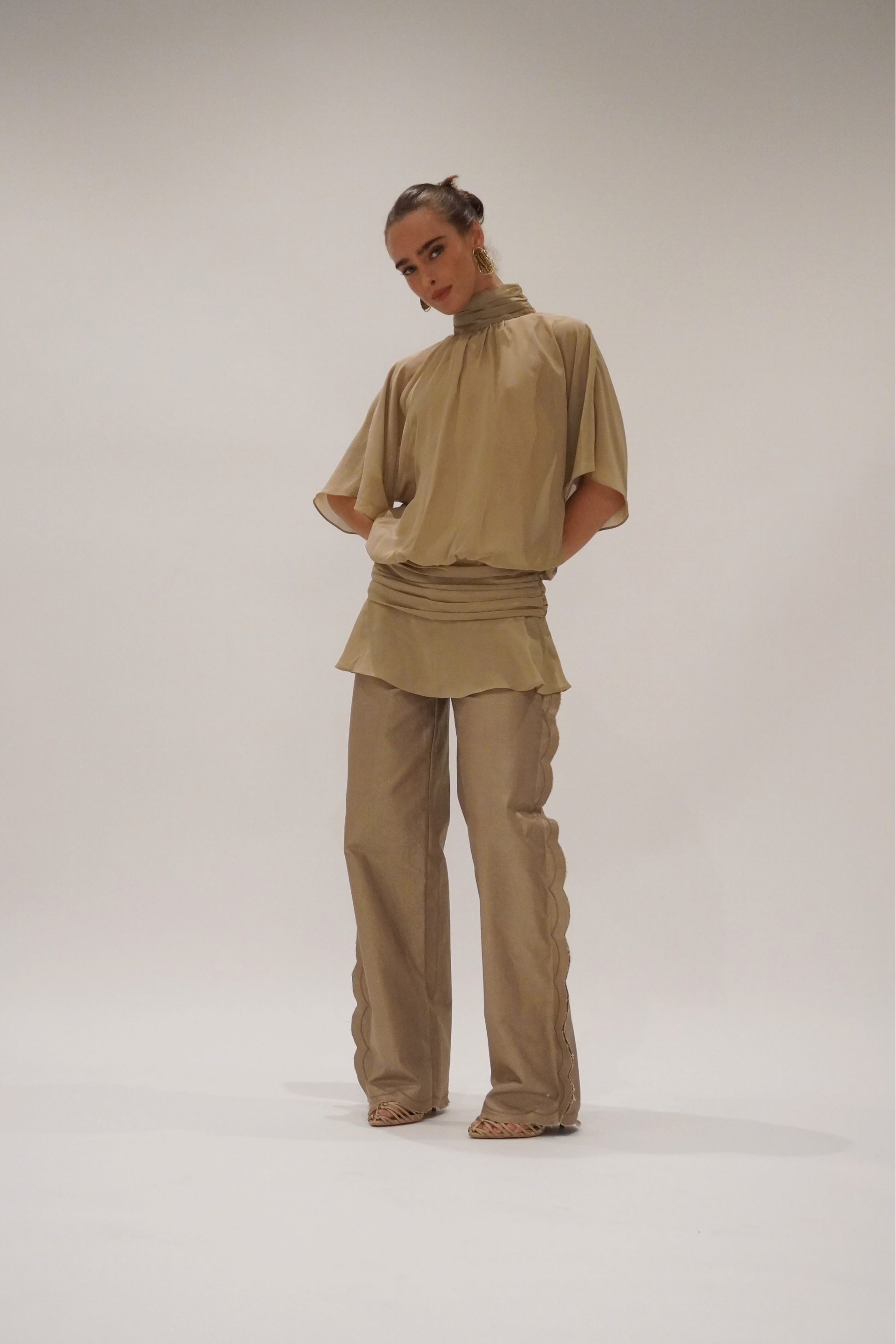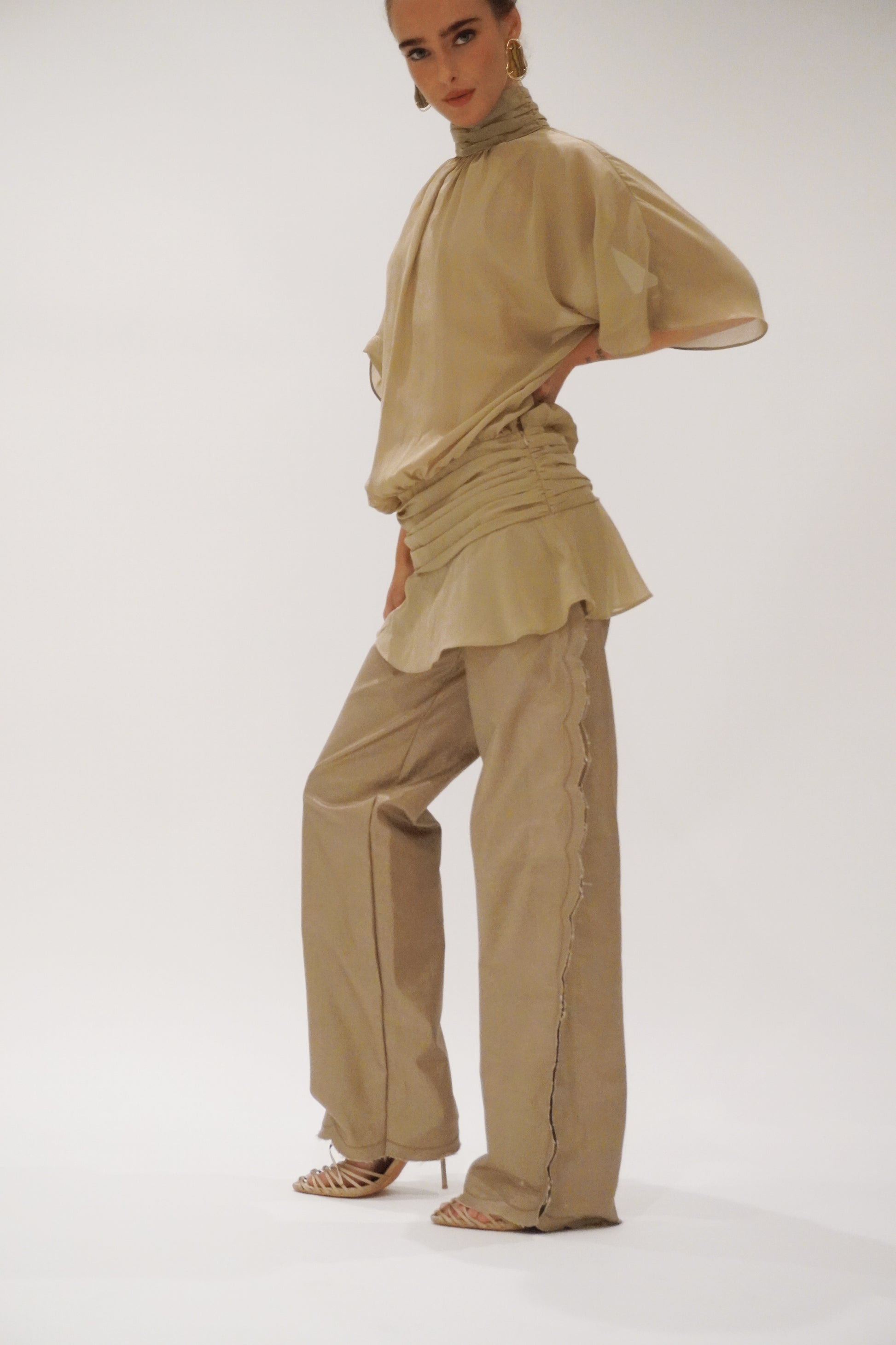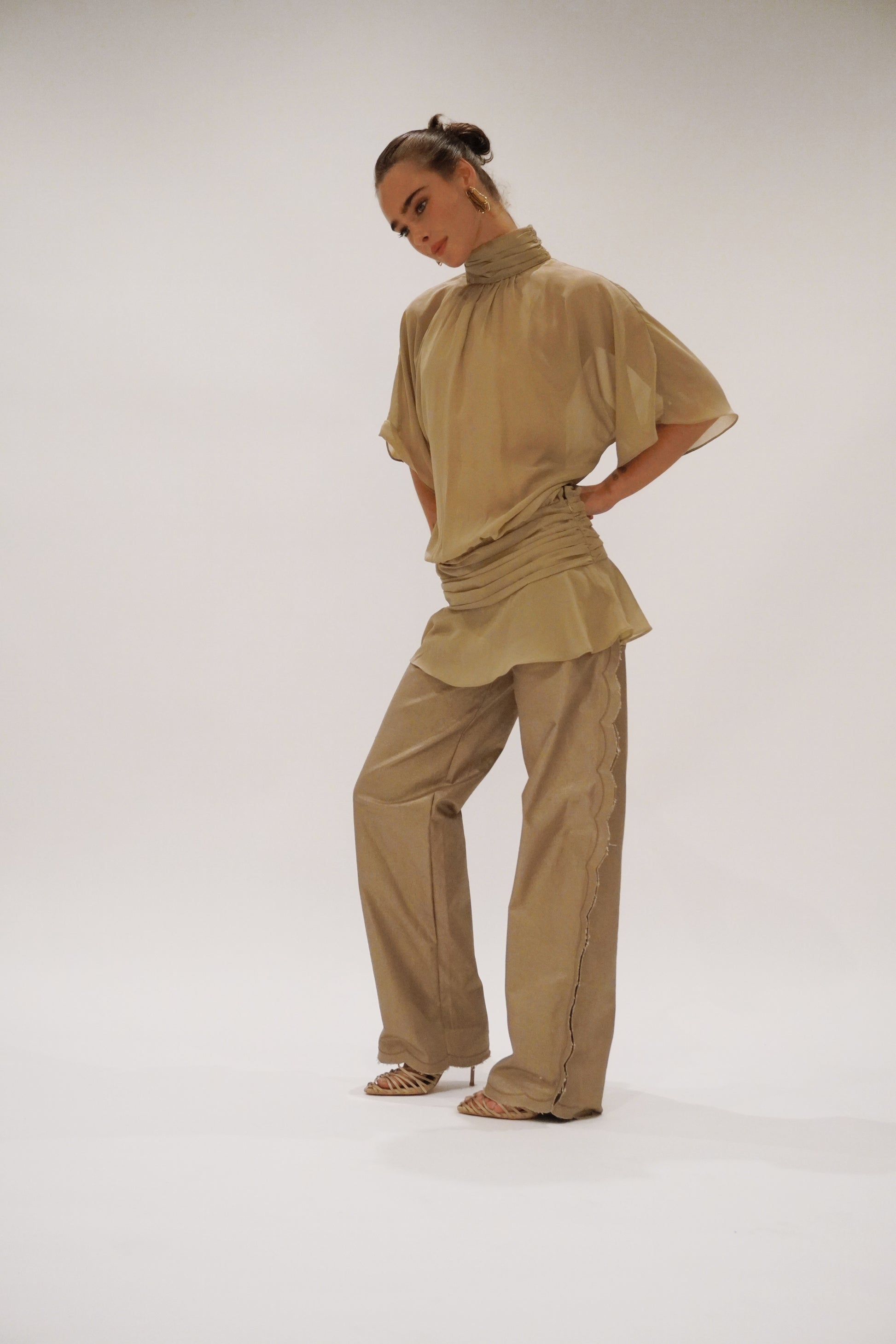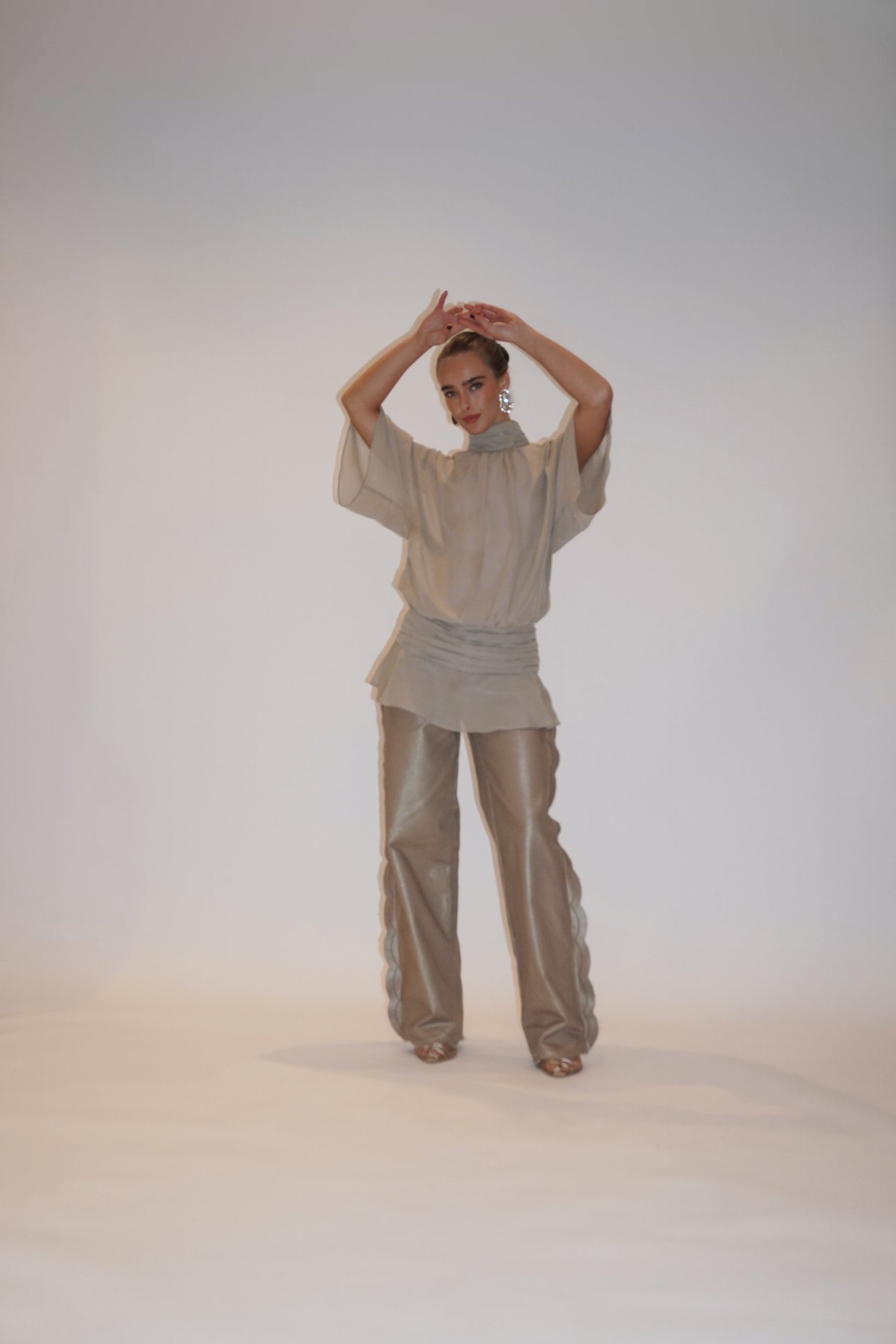This set embodies that quiet confidence. A high-neck chiffon top drapes elegantly across the frame, its batwing sleeves moving subtly, its sheer softness anchored by a structured, wide ruched belt that sits confidently at the hips — drawing the silhouette inward before releasing it back into flow.