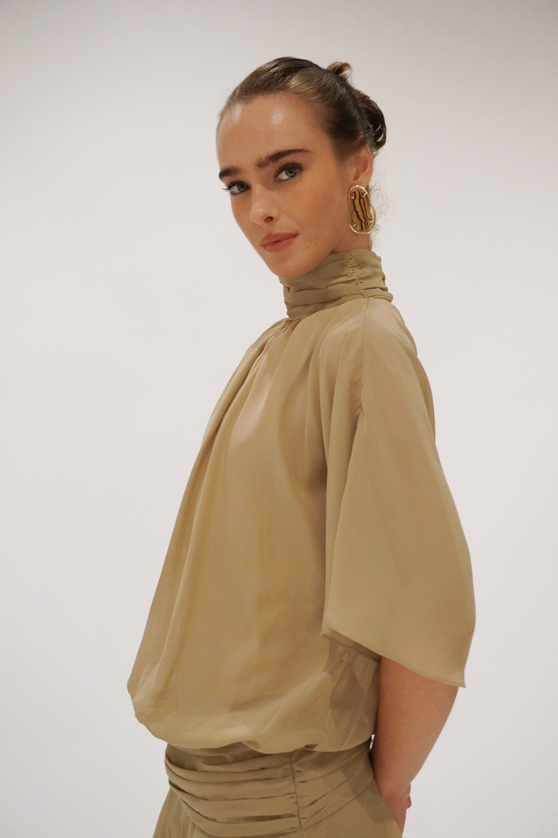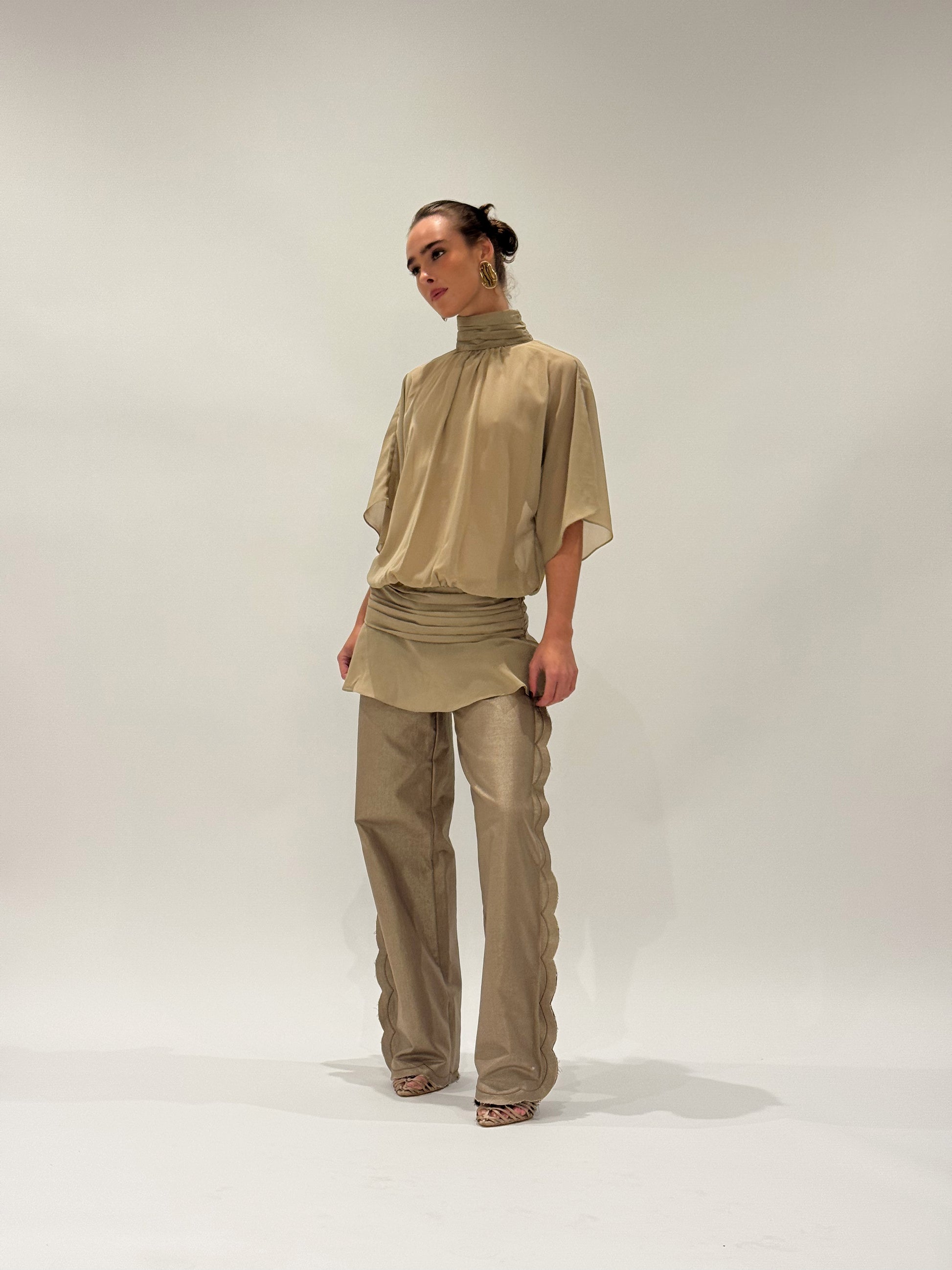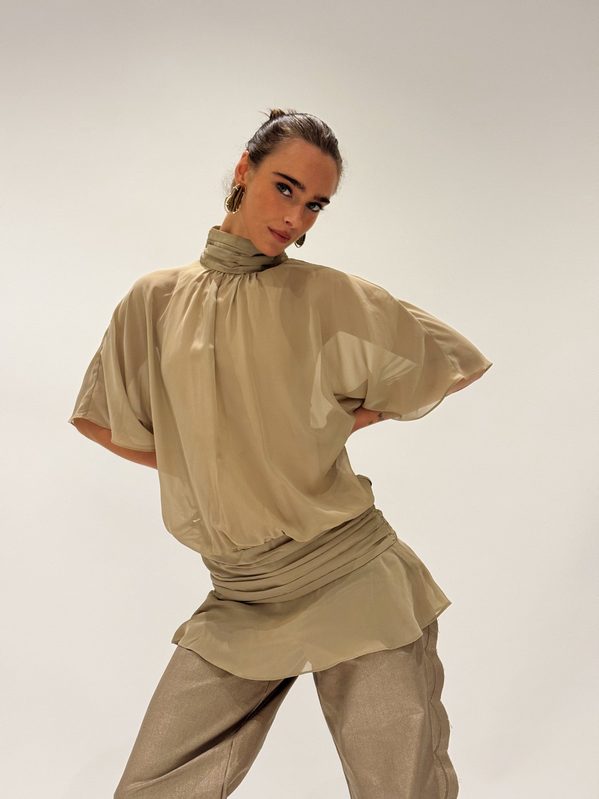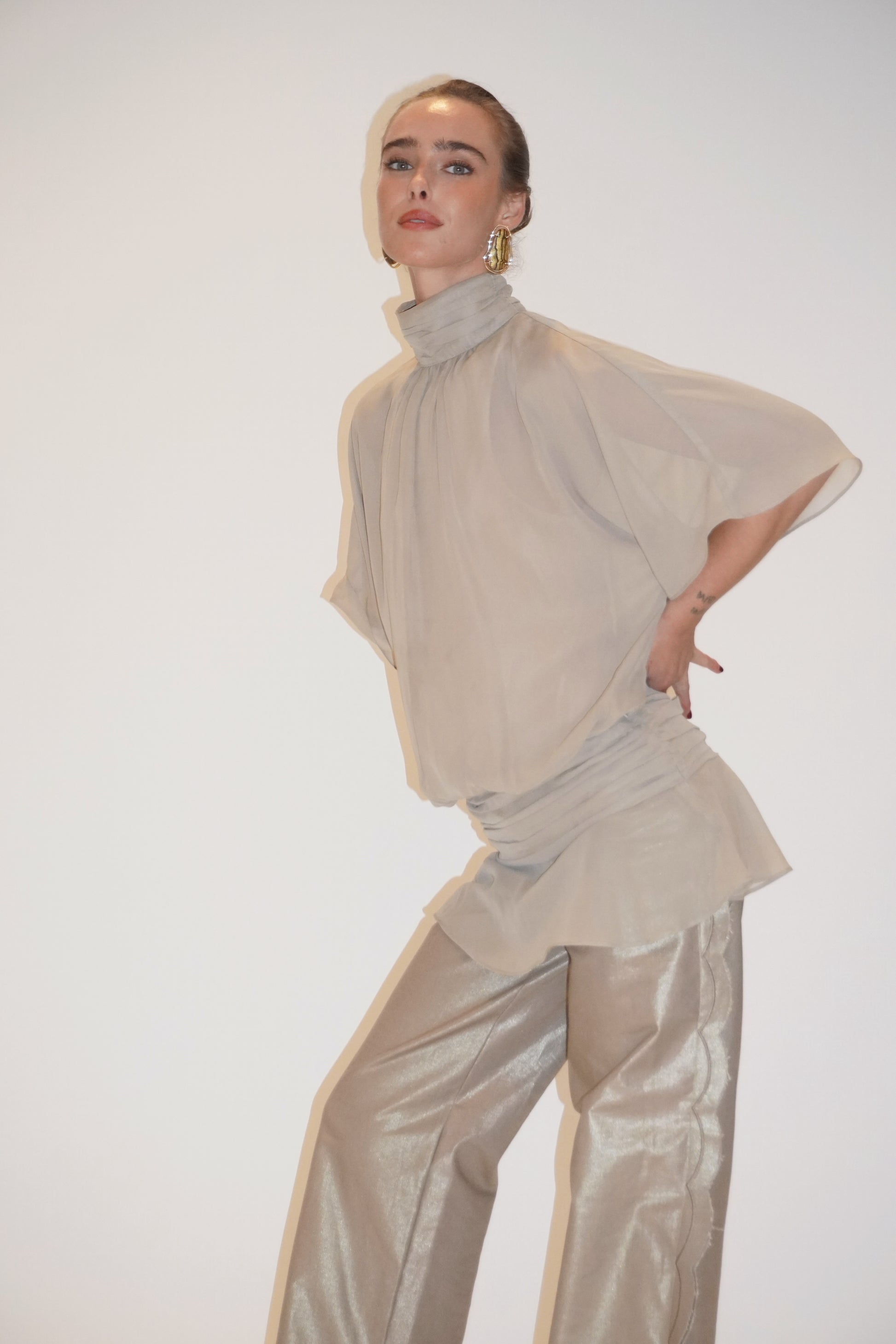 This set embodies that quiet confidence. A high-neck chiffon top drapes elegantly across the frame, its batwing sleeves moving subtly, its sheer softness anchored by a structured, wide ruched belt that sits confidently at the hips — drawing the silhouette inward before releasing it back into flow.