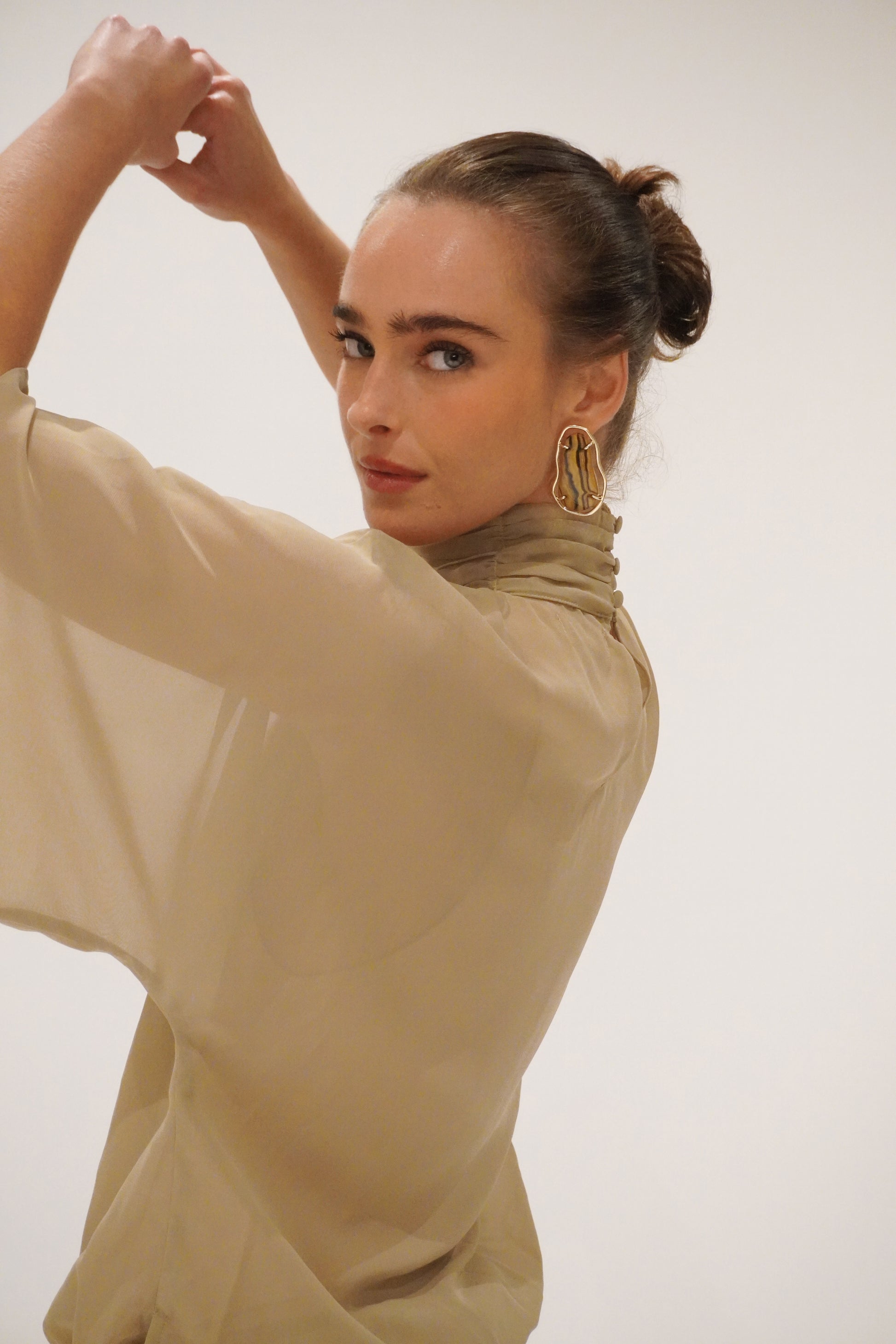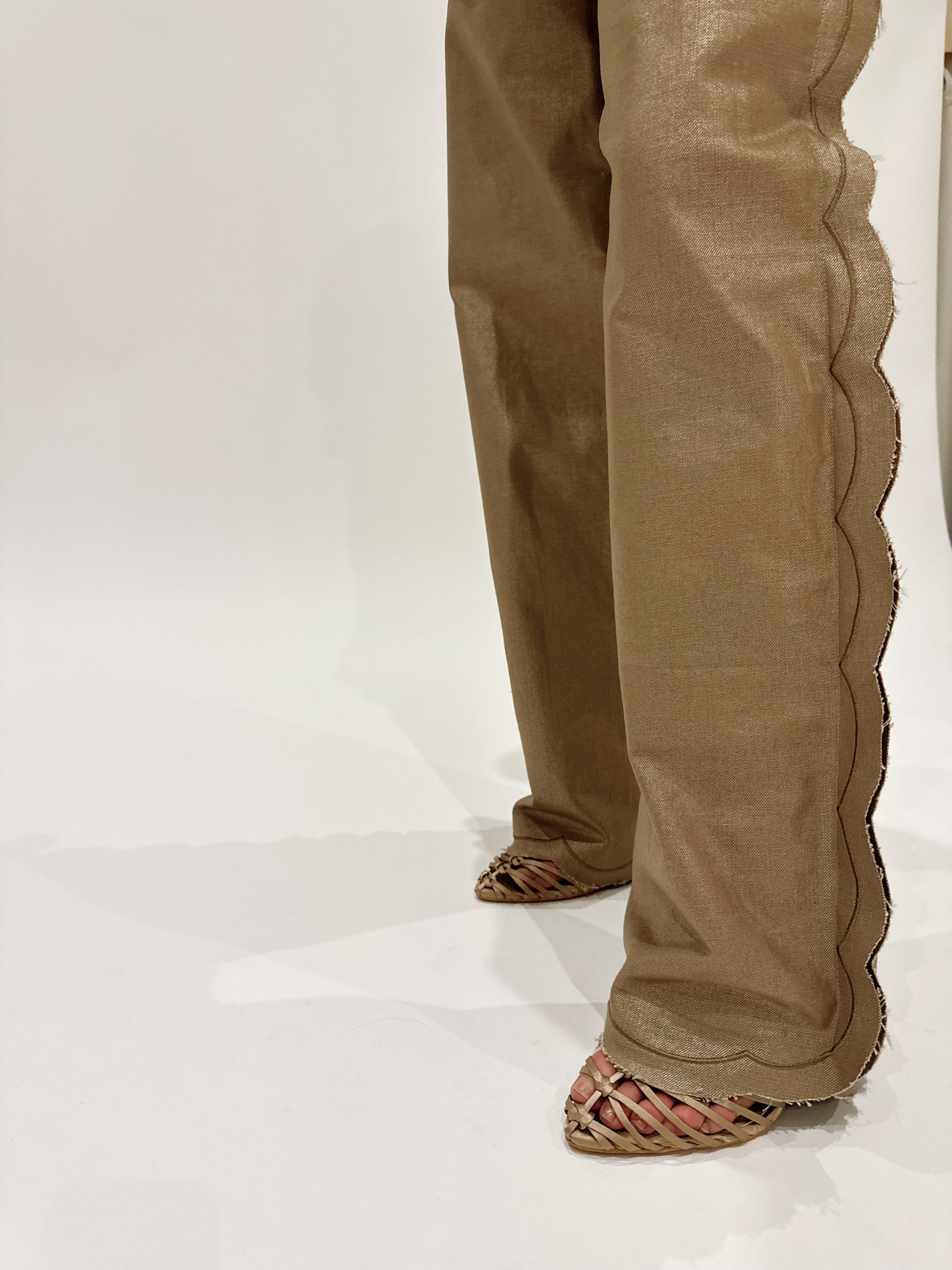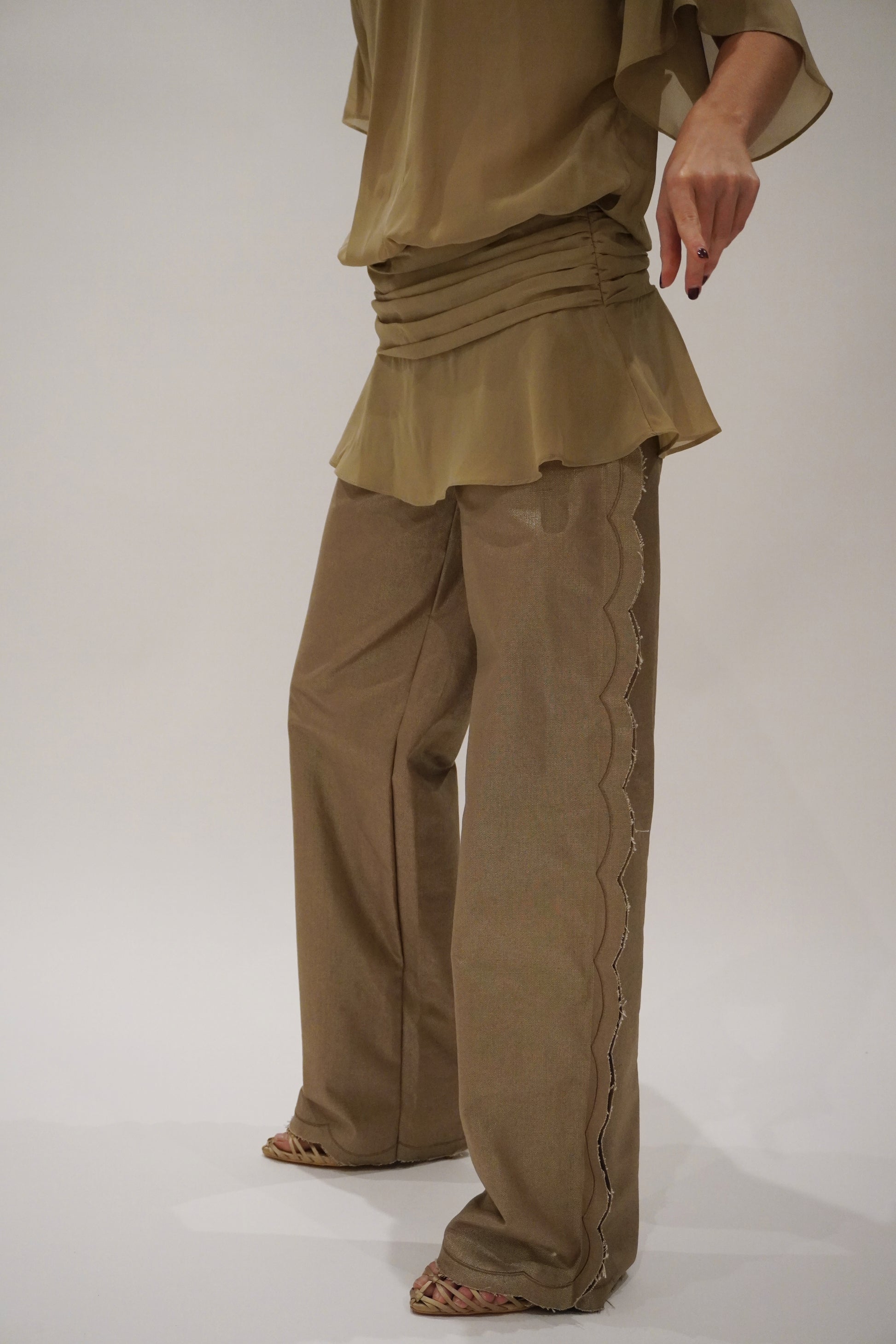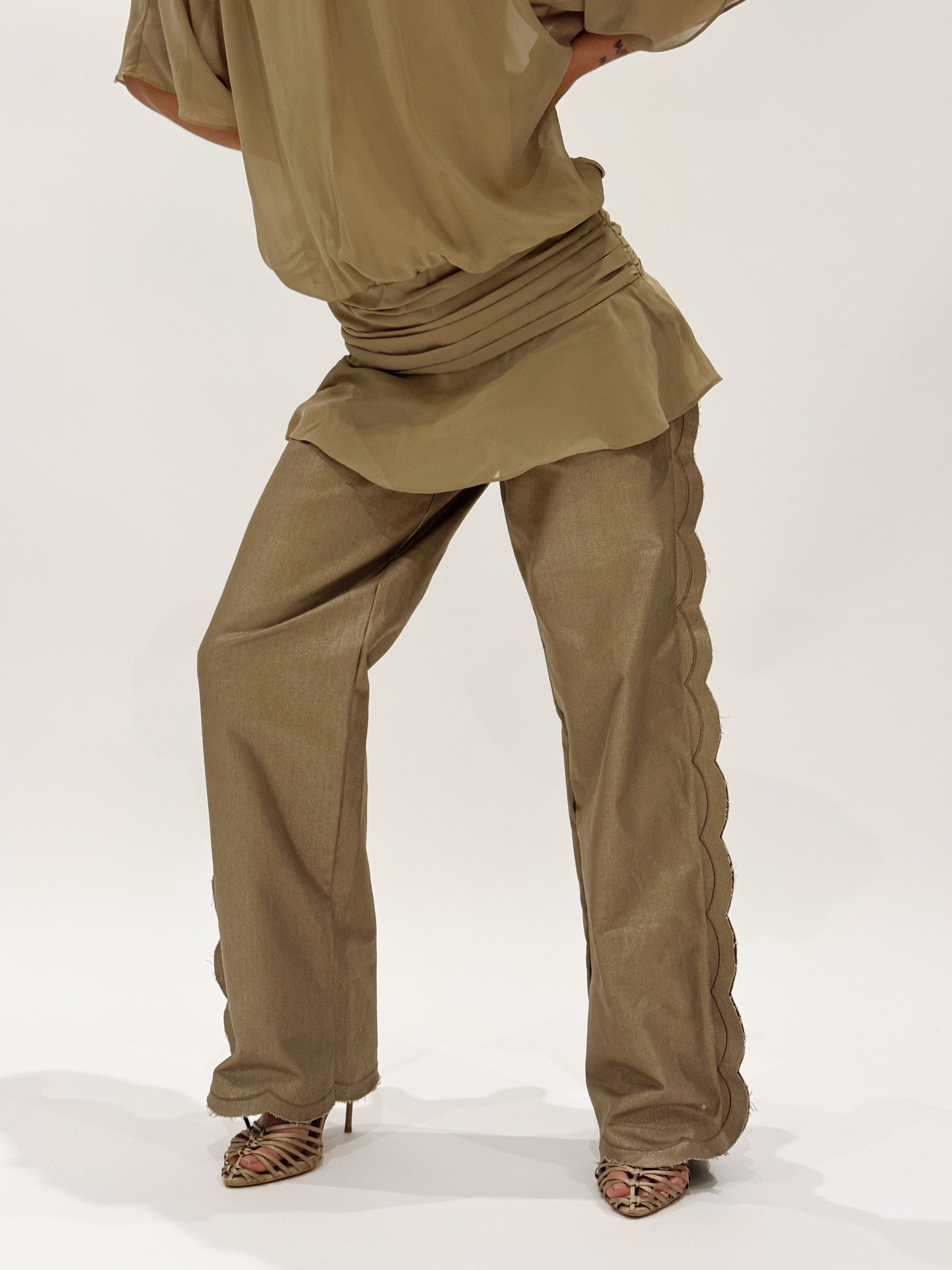 Contrasting against the above, tailored scalloped trousers cut from a dupion style fabric bring form and texture — echoing the mineral edges of the crystal itself. The result is a look that fuses strength, polish, movement and ritual.